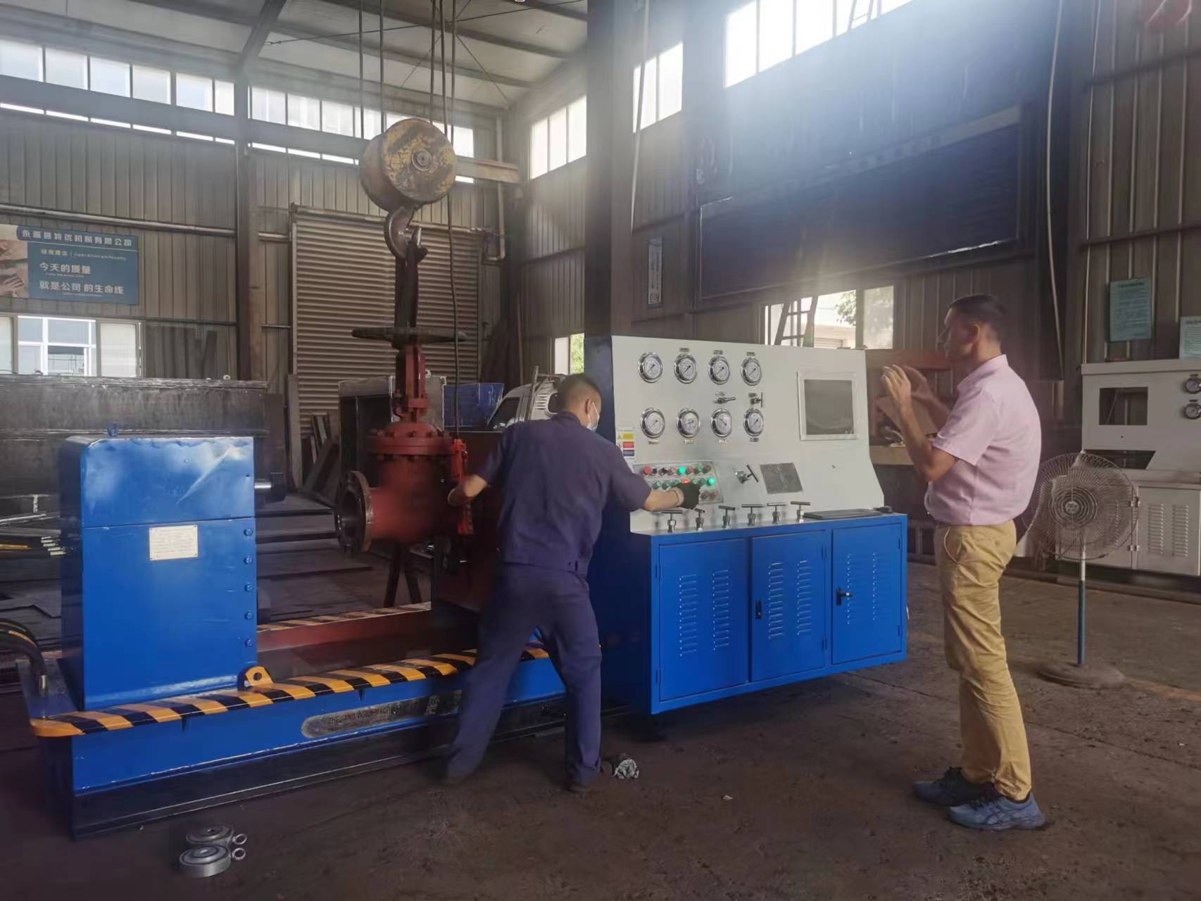 一、被試閥門的裝夾按該測試臺型號選擇通徑大不的被試閥門(閥門試壓機),調整測試臺的左向工作裝夾位置,將被試的閥門放在測試臺左向夾緊工作臺的密封盤中心,點動 <左徑向進>按鈕,將壓爪進到被試閥門的法蘭背后面的正確位置,按<左軸向緊>按鈕<參照夾緊油缸所需壓力對照表 >中的液壓壓緊系統(tǒng)<增壓>;PN值,按<左向增壓>按鈕,調節(jié)<增壓調節(jié)閥>,將<左增壓表>;的壓力和夫緊油缸所需壓力對照表中的閥門通徑、壓力、 PN值相同,一切正確后,關閉<;氣總開關、氣表開關泄壓開關>。開<水總開關、左向進水>既可作被試閥門密封測試。