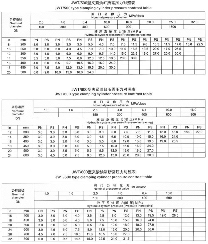 根據(jù)被試閥門公稱通徑和公稱壓力,調節(jié)電接點壓力表和被試閥門壓力相同。參照《壓緊油缸所需壓力對照表》將壓緊油缸壓力增壓到所需壓力要求。 (注:增壓按鈕可要多次點動,每次按動相隔時間需在5-10秒鐘左右)。