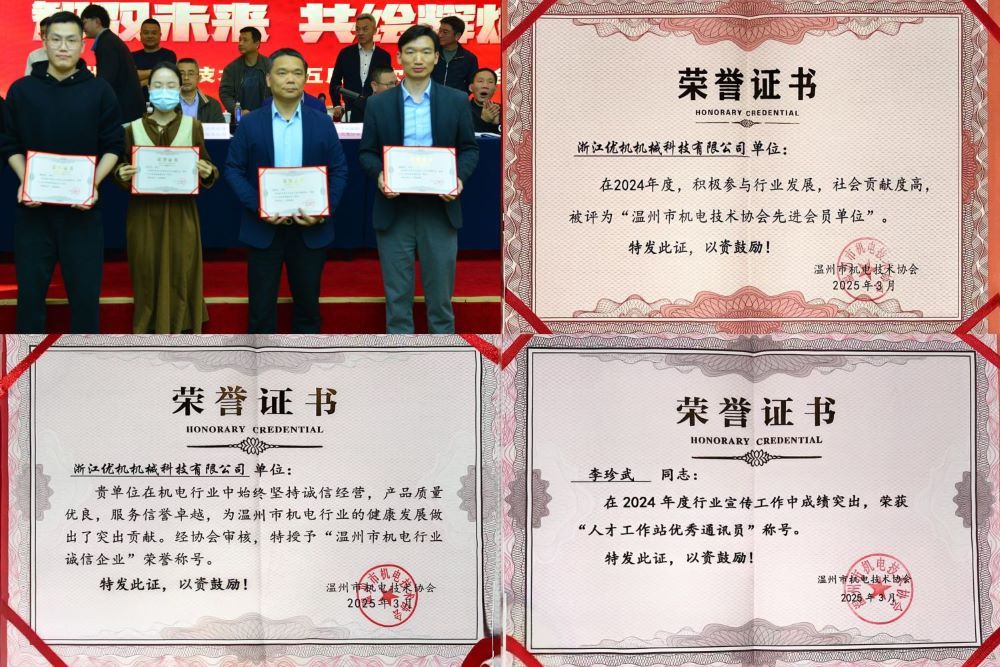 3月26日,在溫州市機電技術(shù)協(xié)會五屆三次會員大會上,浙江優(yōu)機機械科技有限公司憑借卓越表現(xiàn),榮獲2024年度"溫州市機電行業(yè)誠信企業(yè)"和"溫州市機電技術(shù)協(xié)會先進單位"兩項榮譽稱號。公司總經(jīng)理李珍武同時獲評"機電協(xié)會人才工作站優(yōu)秀通訊員"稱號。